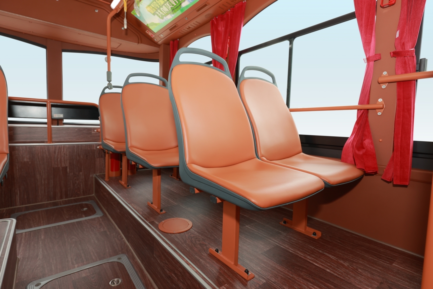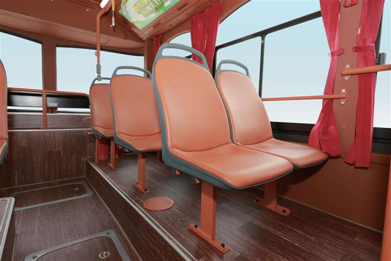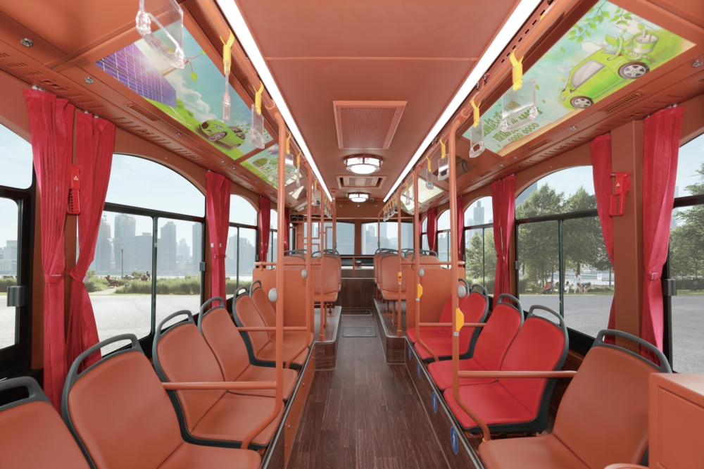 金龍純電動鐺鐺車不僅外表承襲經典,其內部也無限接軌未來。復古的車廂內部有別于傳統公交的設 計風格,古韻燈具、屏風和木紋地板更為車廂平添了一絲儒雅氣息。LED 超大顯示屏、360 度全方位 視頻監控及車載空氣凈化器等現代化配備,造就復古與現代的完美結合,精致由內而外。