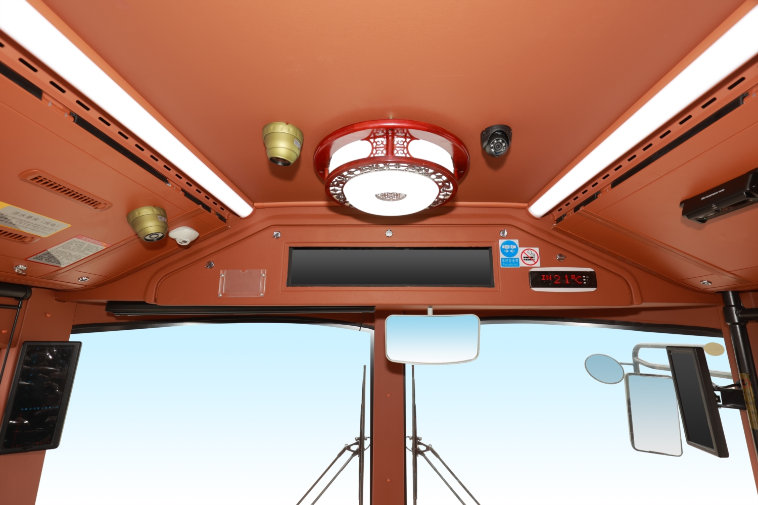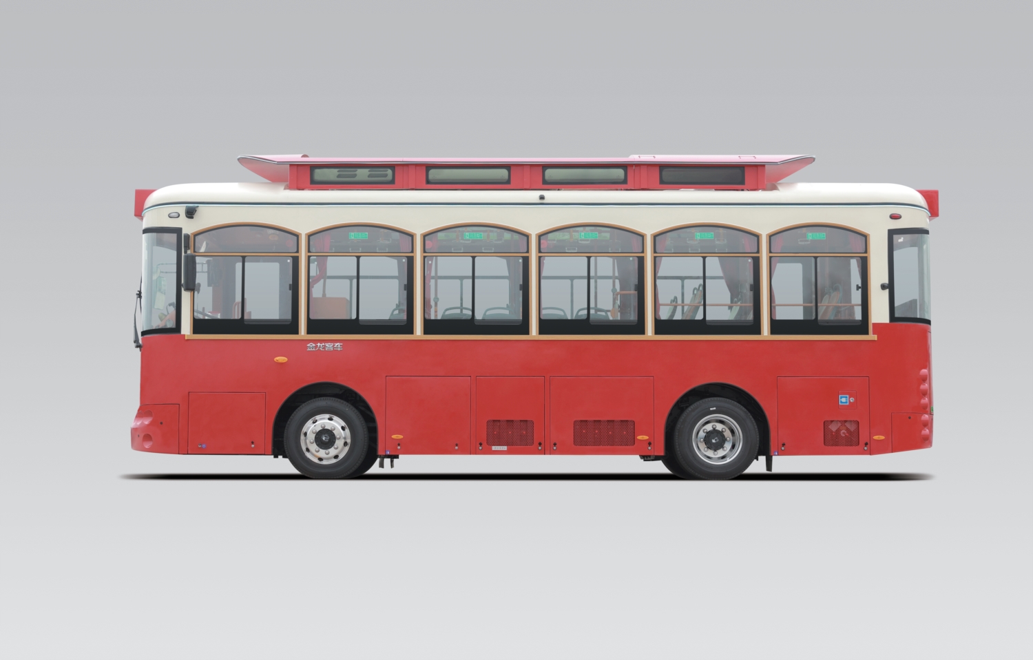 金龍純電動鐺鐺車駕駛艙將復古美感與現代科技的結合展現得淋漓盡致。鏤空屏風包圍而成的獨立駕 駛區,為司機營造不受干擾的自主駕控空間。液晶顯示屏及真皮減震座椅等現代化智能設備鑲嵌于復 古風格之中,智捷駕駛的同時喚醒時代記憶,再次馭見經典。