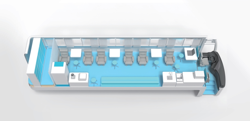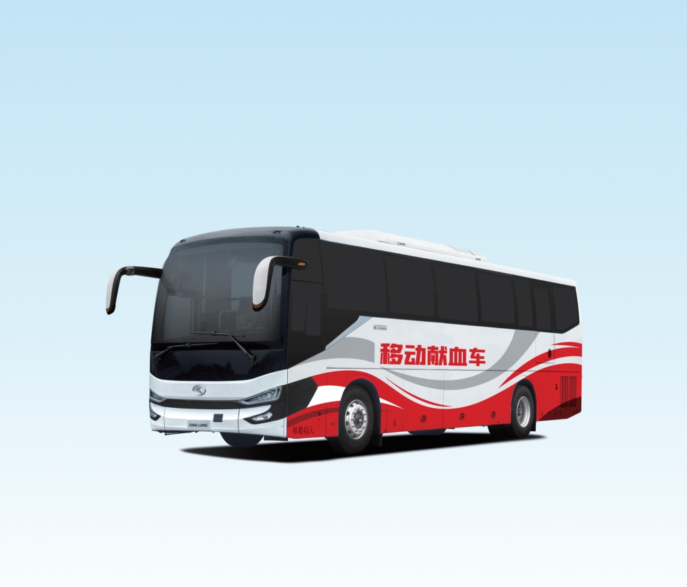 11大巴客車平臺,車內空間寬敞,搭載市電空調,配備3個采血位和6個采血椅,配有微波爐、食品冰箱、飲水機等生活設施,設有應急休息床,可最大限度保障獻血者的舒適度和人身安全。此外還可裝配拓展倉,拓寬車內采血空間。