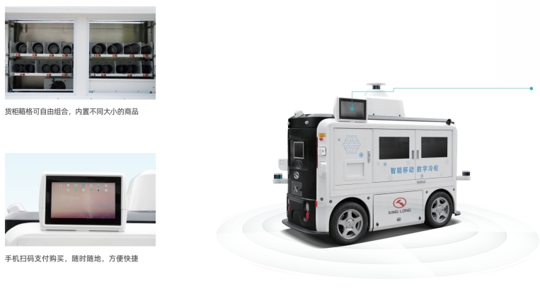 | 用途 | 園區移動小攤點,隨時隨地提供飲料、雪糕、餐食便利。 車輛能自動行駛、轉彎、臨停或繞行障礙物,可實現定點停車、固定路線巡航、預約停車等; 可適應晴天、陰天、輕度霧霾、小雨等多種氣候條件下運營,在園區內礦泉水、可樂、雪糕、套餐等。 | |