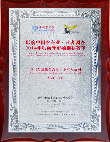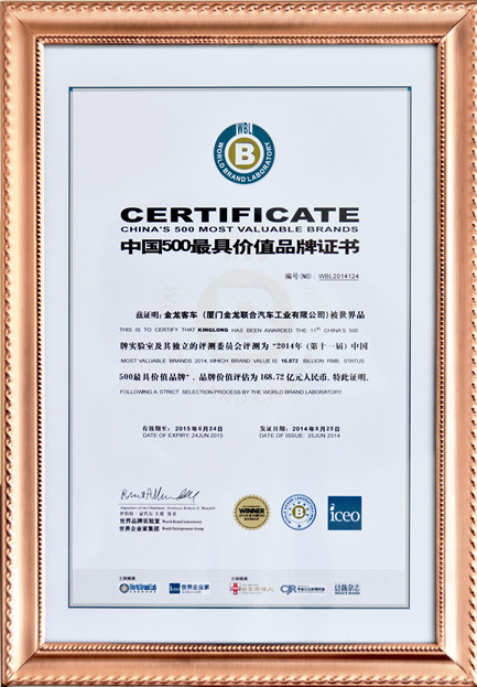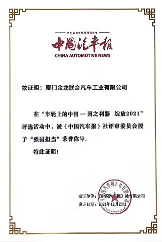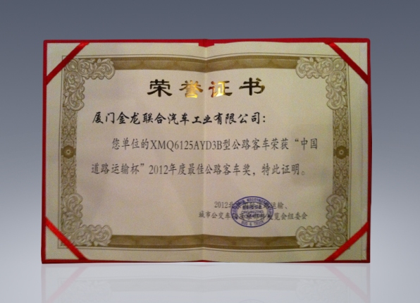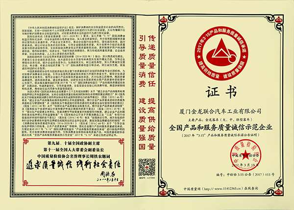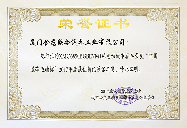 2017-中國客車工業60周年榮譽證書-十大公路-旅游客車-XMQ6129Y
