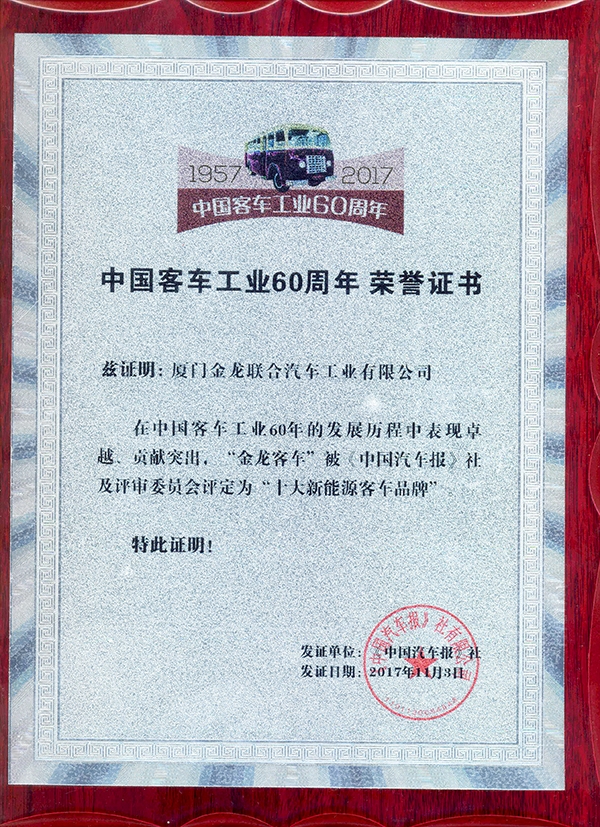 2017-中國客車工業60周年榮譽證書-十大新能源客車品牌