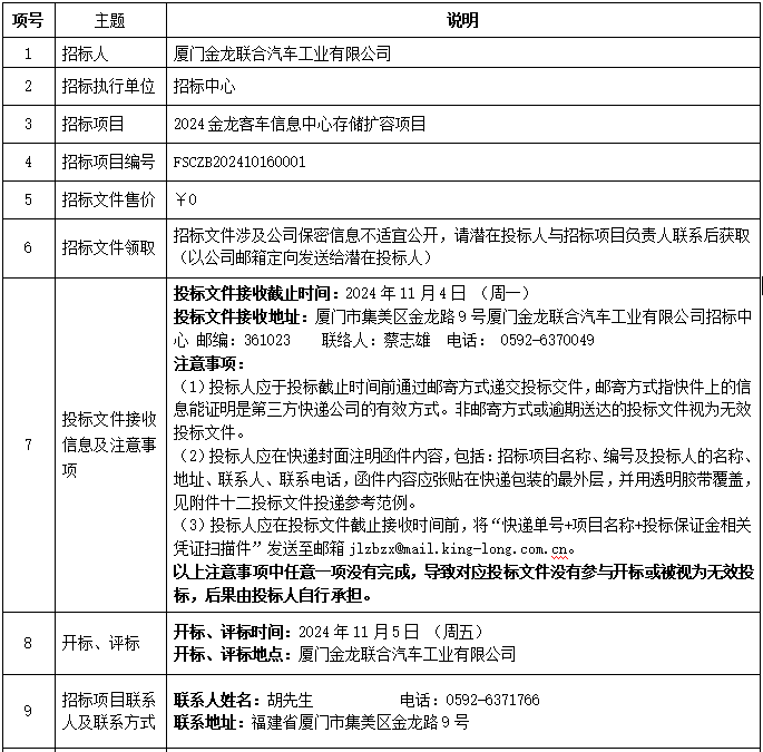 2024金龍客車信息中心存儲擴容項目公開招標公告