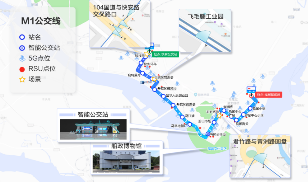 金龍客車建設了福州市首條基于5G C-V2X車路協同開放智慧化道路M1線。線路全長10.3km,共部署43個5G基站、14組智能紅綠燈、22個路側單元、3組融合感知交叉路口以及2個智慧公交站臺,實現5G/C-V2X網絡全覆蓋,搭建起人、車、路、網和云的感知融合通信橋梁,建設國內技術領先的智慧示范道路。有效的減少路上50%以上危險駕駛行為,大大提升了道路的安全水平。
